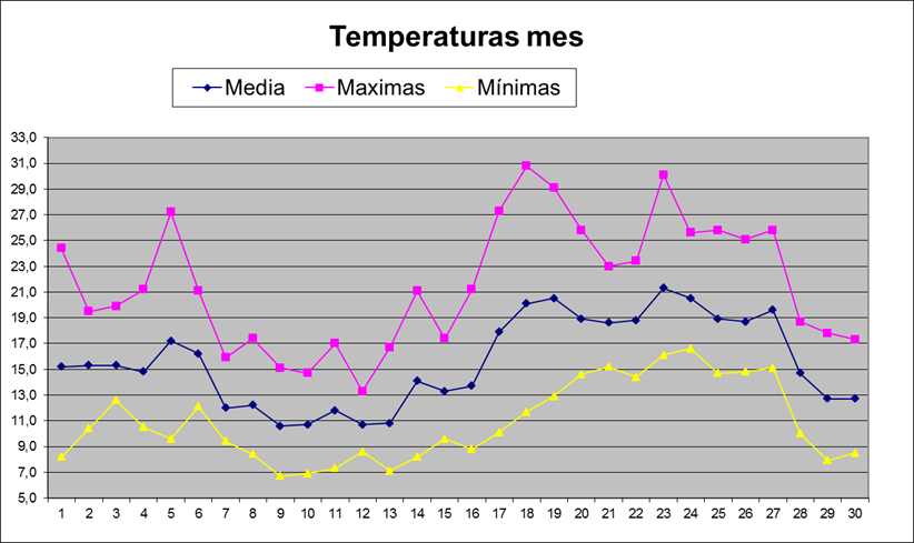| Media del mes: | 15,6 | 15,84 | -0,24 | ||||||||||||||||