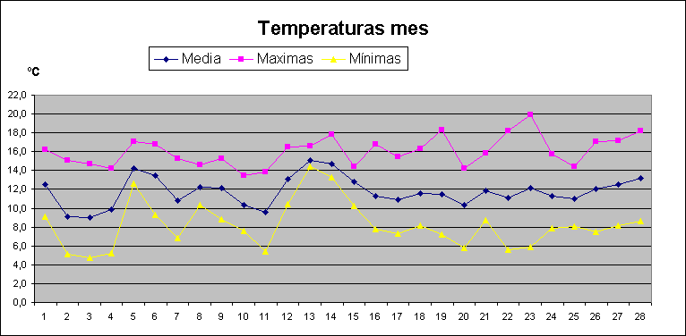 | Media del mes: | 11,8 | 11,5 | 0,30 | ||||||||||||||||||