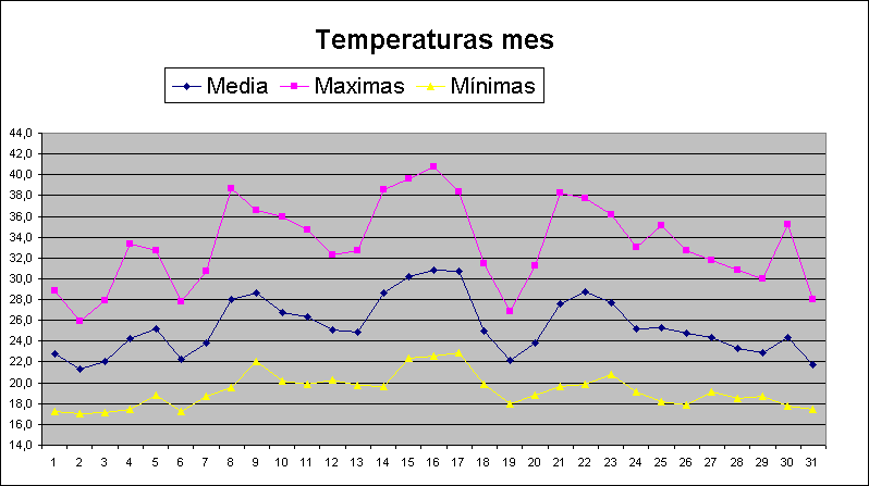 | Media del mes: | 25,4 | 27,07 | -1,67 | |||||||||||||||||