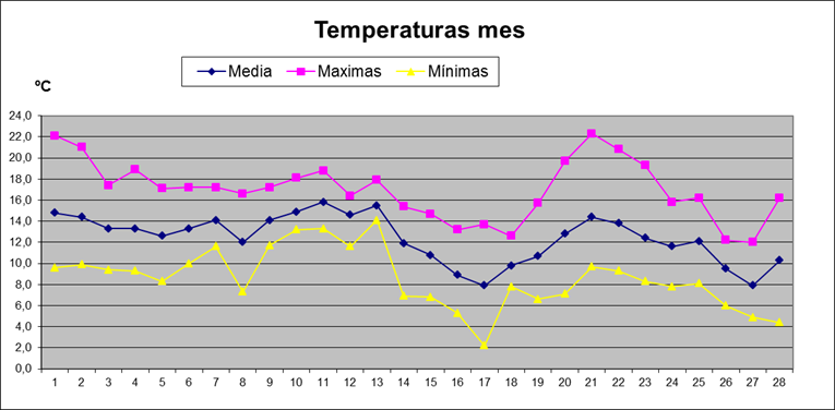 | Media del mes: | 12,4 | 11,5 | 0,90 | ||||||||||||||||||