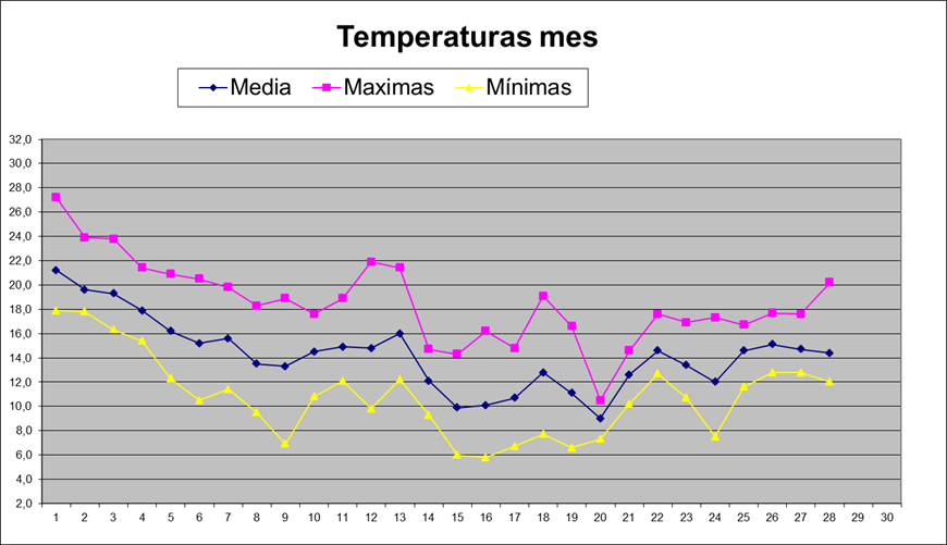 | Media del mes: | 14,2 | 13,9 | 0,30 | |||||||||||||||||||