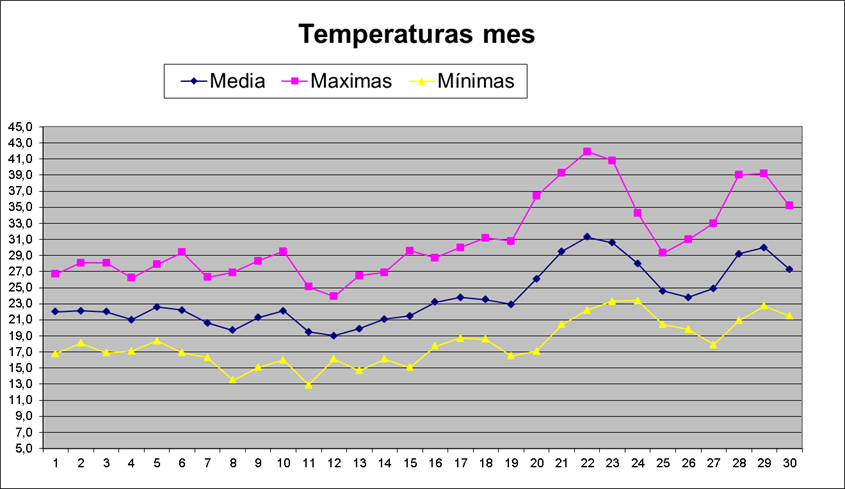 | Media del mes: | 23,8 | 23,5 | 0,30 | ||||||||||||||||