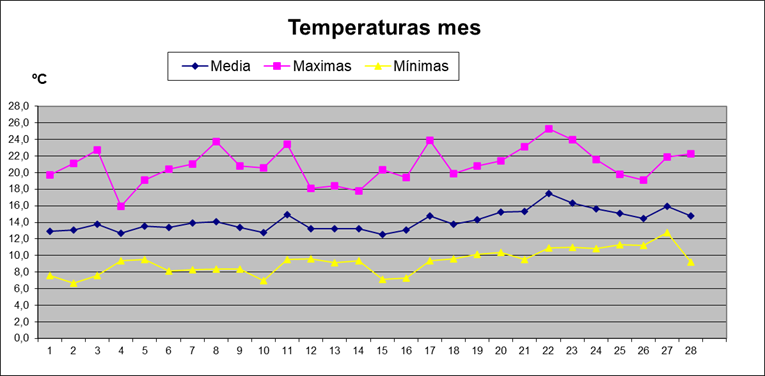 | Media del mes: | 14,2 | 11,5 | 2,70 | ||||||||||||||||||
