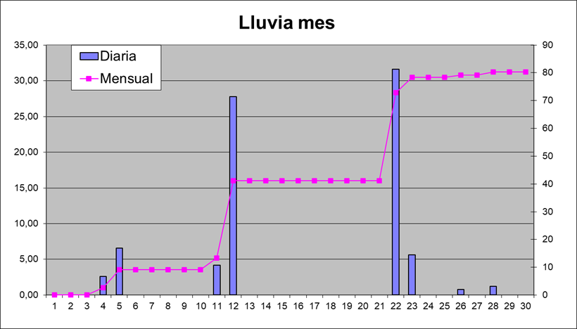 | Máximo de Lluvia: | 31,60 | 22/4/22 | |||||||||||||||||