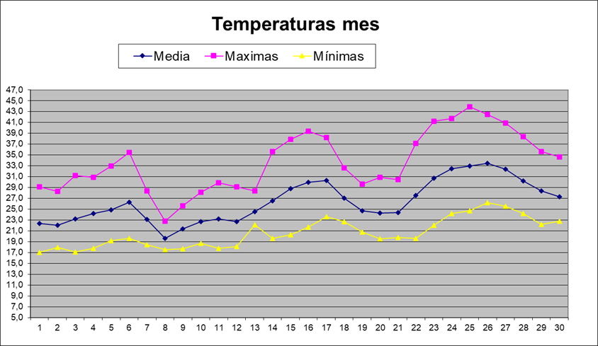| Media del mes: | 26,5 | 23,5 | 3,00 | ||||||||||||||||